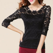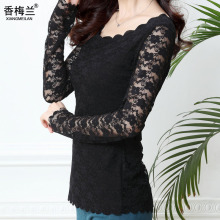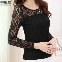 春秋蕾丝打底衫女长袖上衣韩版修身显瘦大码性感潮黑色圆领小衫
