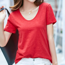 纯色V领纯棉竹节棉宽松女半袖百搭大红纯白色夏装低领大码短袖T恤
