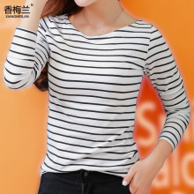 气质纯棉2017春季新款条纹长袖T恤女弹力紧身百搭一字领打底衫