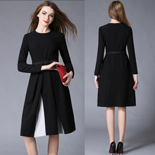 2017春秋新款欧美气质黑色修身显瘦长袖连衣裙时尚拼色A字裙女潮