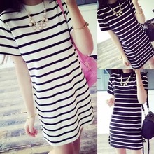夏季新款韩版黑白条纹连衣裙睡衣女短袖加大码中长款睡裙女家居服
