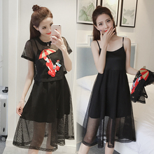 网纱连衣裙两件套女夏2017新款镂空短袖上衣吊带中长款a字裙套装