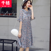 碎花连衣裙子女夏2017新款喇叭袖小清新荷叶边雪纺连衣裙女中长款