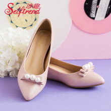 涉趣内增高单鞋女 秋新款甜美蝴蝶结珍珠浅口尖头中跟女鞋W53053