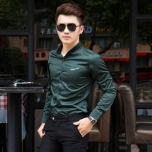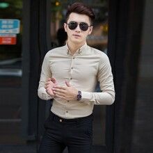 男士中袖光滑料七分袖衬衫春季新款韩版免烫绣花衬衣潮男长袖衬衫