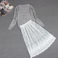 秋冬欧美时尚透视蕾丝拼接中长款毛衣女 气质羊绒衫毛衣裙两件套