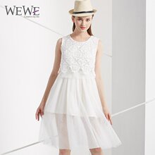 WEWE/唯唯夏无袖圆领假两件连衣裙白色时尚修身蕾丝女裙