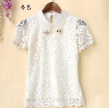 新款上衣 淑女衬衣领镂空绣花修身网纱短袖蕾衣衫