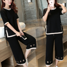 2017春装新款针织冰丝休闲时尚气质百搭阔腿裤套装时髦两件套夏装