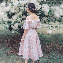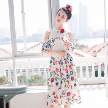 花间裳/扶桑/原创甜美显瘦露肩小立领印花雪纺连衣裙夏休闲长裙仙