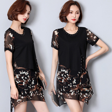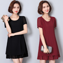 加肥加大码女装2017夏季新款潮大码胖mm假两件短袖雪纺显瘦连衣裙