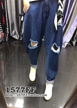 2017欧洲站泰国潮牌破洞磨破宽松大码胖mm牛仔休闲哈伦裤
