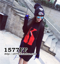 2016秋冬欧美泰国潮牌字母K拼接流苏穗穗做旧加厚中长款宽松毛衣