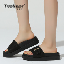 月芽儿夏季新款松糕厚底平底女拖鞋真皮露趾一字拖复古懒人拖