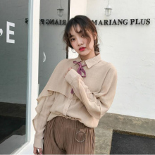 春季新款韩版chic复古荷叶边蝴蝶结长袖衬衫百搭翻领长袖衬衣女潮