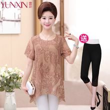 云新中年妈妈装中长款夏季T恤衫圆领蕾丝短袖40-50大码时尚妈妈装