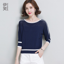 冰丝针织衫女一字领套头宽松七分袖夏季新款韩版条纹T恤显瘦上衣