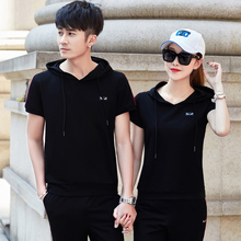 2017新款夏季情侣运动套装男士短袖运动装长裤休闲连帽跑步运动服