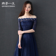 宴会晚礼服2017新款长款一字肩学生优雅主持人女性感伴娘服公主夏