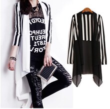 包邮女夏新款女装欧美大码黑白条纹拼接雪纺开衫中长款薄防晒外套