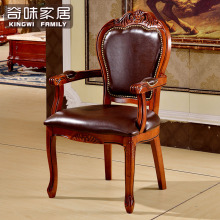现货包邮欧式餐椅实木 美式田园餐桌椅子仿古深色皮艺咖啡扶手椅