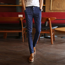 春夏薄款青少年男士休闲裤男夏款修身型小脚裤男生棉麻子松紧腰带