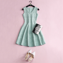 欧美设计师 立体纹理提花 薄荷绿 修身针织百褶A字包袖连衣裙