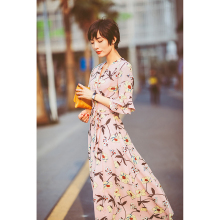 优雅女神款粉色花色围裹裙 荷叶边喇叭袖 V领系带裹身长裙连衣裙