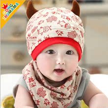 新生儿帽子口水巾套装新品小怪兽两角套头帽三角巾二件套宝宝春帽