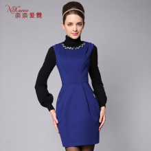 奈奈爱霓2017春装新款韩版修身钉珠娃娃领拼接长袖雪纺连衣裙5537