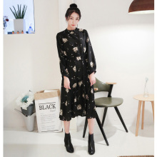 2016春夏新品圆领长袖碎花雪纺连衣裙显瘦系带百搭长裙女