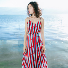 夏季新品女装无袖条纹吊带雪纺连衣裙长裙波西米亚海边度假沙滩裙