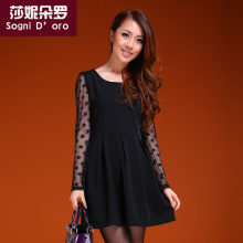 大码女装200斤特胖mm秋装韩版圆领网纱长袖连衣裙