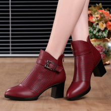 瑾蔻春季新款真皮妈妈网靴女镂空短靴真皮粗跟女鞋凉皮鞋女单靴子