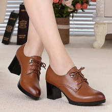 新款女鞋牛皮中跟鞋粗跟休闲女式皮鞋系带真皮大码41-43深口单鞋