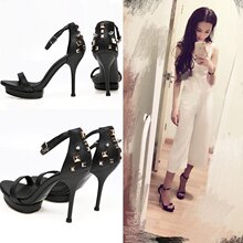 2017夏季超高跟凉鞋细跟防水台黑色真皮性感夜店一字扣铆钉高跟鞋