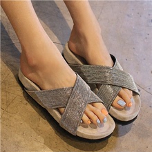 2017夏季女凉拖链珠水钻交叉带真皮松糕拖鞋厚底露趾沙滩鞋凉鞋女