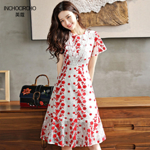 连衣裙女2017新款夏季小清新学院风中长款高腰修身显瘦印花a字裙