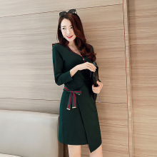 2017新品春针织中长款连衣裙修身蝴蝶结不规则裙子V 领包臀打底裙