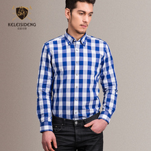 克雷司登春秋款纯棉蓝白格子男士长袖衬衫青年韩版修身休闲寸村衣
