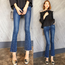 2016秋季新款韩国潮流鱼鳞抓纹毛边微喇叭牛仔裤女九分裤修身显瘦