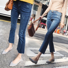 韩国正品春秋新款欧洲站一字破洞八分九分微喇叭牛仔裤女弹力显瘦