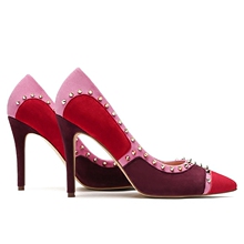 2017新款欧美真皮铆钉尖头高跟鞋黑色细跟拼色性感浅口单鞋女小码