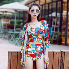 贝迪斯高腰比基尼分体泳衣女 三件套罩衫复古印花小胸聚拢泳装