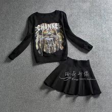 欧洲站秋季新款女装圆领老虎头印花图案上衣+纯色半身裙休闲套装