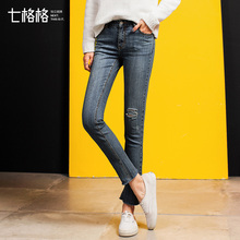 七格格裤子女春季2017新款九分裤不对称磨破毛边脚口牛仔裤小脚裤