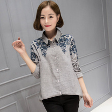 2017春装新款女装条纹长袖衬衫女士中长款衬衣精致绣花百搭打底衫