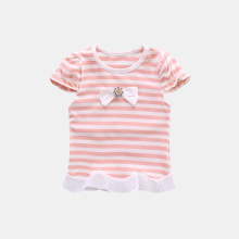 儿童装短袖T恤中小童两色细条纹体恤女童圆领花边上衣泡泡袖打底