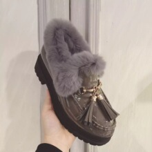 韩国代购 复古金属扣漆皮圆头松糕厚底裸靴流苏蝴蝶结兔毛毛短靴