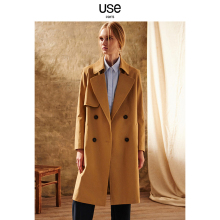 复古H型厚风衣女USE2017春装新款欧美双排扣修身中长款ol风衣外套